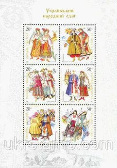 20.12.2001 Мал. Аркуш із марок серії "Українські народні одягу 2001" Київщина, Черніговщина, Повшивниця" 6 марок по 20 і 50 коп